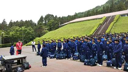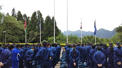 校旗を掲揚し、校歌を斉唱し入所式に臨みました。施設のスタッフからお話があり、この後はクラス写真撮影、昼食となります。