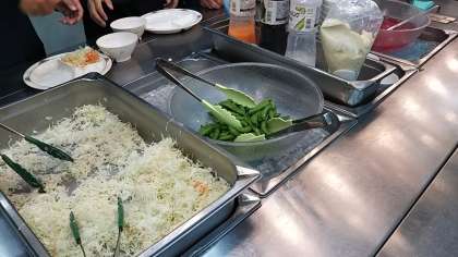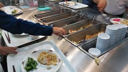 オリエンテーリングでしっかり体を動かしたおかげて、子どもたちは、とてもお腹がすいたようです。本日は、ビュッフェ形式の夕食、どの子どももしっかりと食べていました。