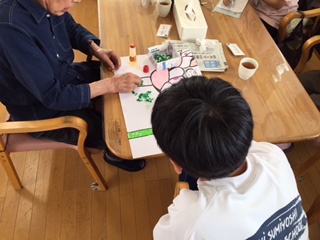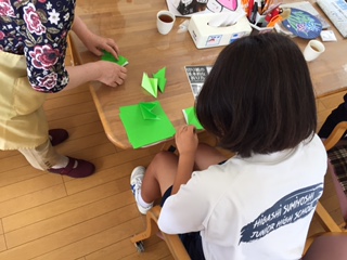 活動の様子です。デイサービスで、折り紙をしたり、おしゃべりをして利用者の方と交流していますが……まだまだ緊張しているようです。