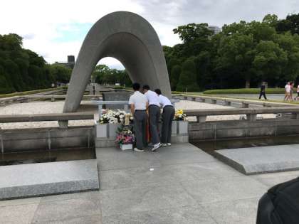 平和記念公園でセレモニーを行いました。生徒代表の平和宣言のあと、折り鶴を捧げました。