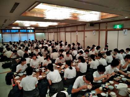 ひと足早く、出発が早いオタフクソース工場と江波山気象館見学グループの朝食が始まりました。
