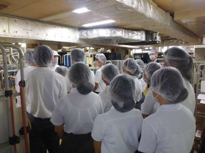ここでは、もみじまんじゅうの原材料について説明を聞いています。詳しい中身については企業秘密です…