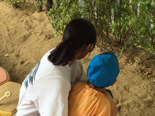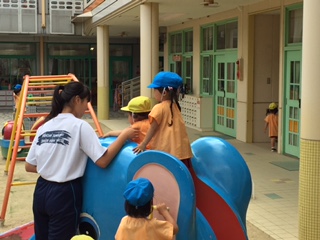 幼稚園では全員が園庭に出て遊んでいました。滑り台や鉄棒で補助をしたり、隅っこでダンゴムシを探したり……。園児たちと一緒に鬼ごっこをしている生徒もいましたよ。