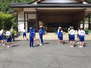 昼食後、バスに乗って、各コースに分かれました。こちらのコースは三段峡トレッキングです。準備運動して、さあ、トレッキングに出発です!