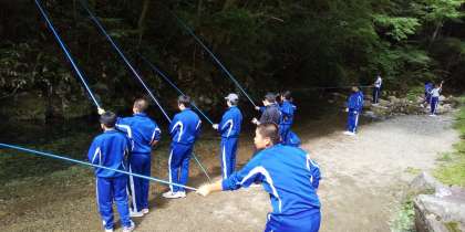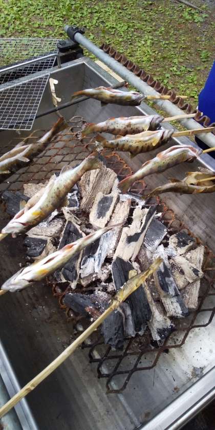 渓流釣りでの活動の様子と釣った魚を塩焼きにしています。釣れたときは大興奮!さあ、釣った魚のお味は?!