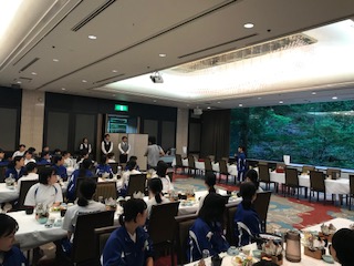 食事会場で入館式を行ったあと、食事係の「いただきます」の挨拶で、夕食が始まりました。