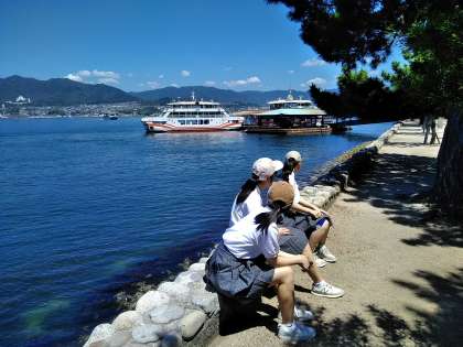 宮島自主活動の時間も残り少なくなってきました。帰りのフェリーを背景に、ハイ・チーズ!