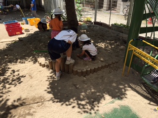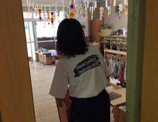 保育園での活動も楽しそうです。ちょうど子どもたちが遊んだおもちゃを片付けに行くところに出会いました。もう1人は園庭で何かを見つけたかな…?