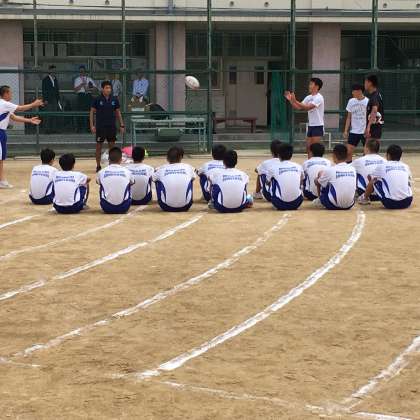 この講座では、高校生のラガーマンと一緒にラグビーを体験しています。ラグビー初心者の生徒も経験者の生徒も、声を出し合って楽しみながらラグビーをしています。