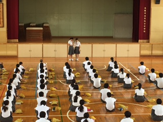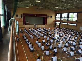 8日(月)5〜6限に、学級委員長司会のもと、保育福祉体験でそれぞれが体験したことや学んだこと、反省点などを施設別に報告しました。体育館は暑いですが、みんな真剣に聞いています。