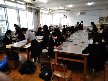 美術部と文芸部の様子です。美術部は、美術室でマーブリングを体験しています。文芸部は、図書室で小説や絵を書いています。中学校の先輩たちと和気あいあいと活動を楽しんでいます。