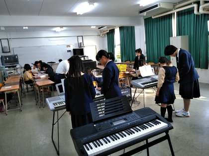 音楽部は、音楽室でさまざまな楽器の演奏体験をしています。初めての楽器の演奏をとても楽しんでいます。