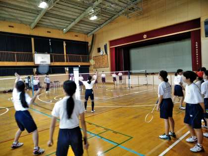 女子バスケットボール部は、ボールを使った基礎練習を教えてもらっています。バドミントン部は、ラケットを使用してスマッシュの練習をしています。