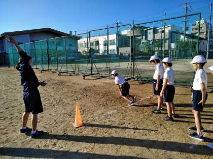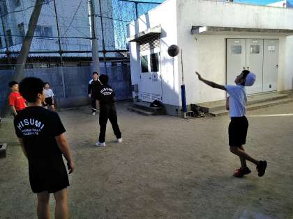 陸上部では、50m走のタイムを計測しています。男子バレー部では、ボールを使った3対3のゲームを体験しています。
