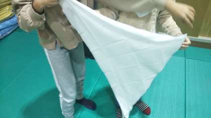 消防署員の指導で、三角巾な使い方を学んでいます。子どもたちは、何度も練習をして、次第に三角巾の使い方が上手になってきました。