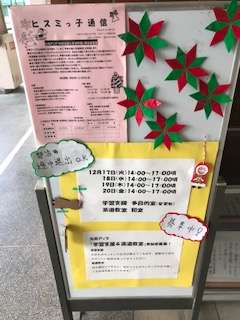 日程は12月17日(火)、18日(水)、19日(木)、20日(金)で、時間は14:00〜17:00頃です。途中入退室可能なので、懇談等で抜けても構いません。場所は、学習支援は談話室か多目的室、茶道教室は和室です。