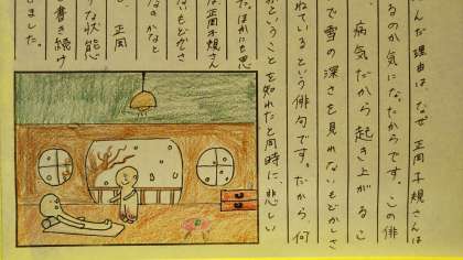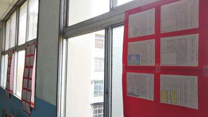 各クラスの前に、3年生の国語科で取り組んだ「俳句の鑑賞文」が掲示されています。鑑賞文とともに、その俳句をイメージしたイラストも描かれています。どの作品も、生徒が一生懸命取り組んだ成果が出ています。懇談に来られた時には、ぜひともご覧になっていただきたいと思います。