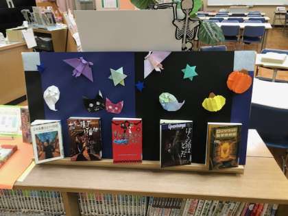 また、「怪談絵本」や「文豪ノ怪談」などの怖い話を集めたコーナーを、図書館支援員の方やボランティアの方が作ってくださったので、見に来てください。