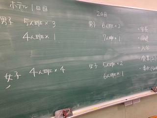 体育大会、文化の集いと行事の準備が続く中、修学旅行の取り組みも進んでいます。19日(月)には、ホテルの部屋割りと係りを決めました。みんな楽しそうに相談しています。