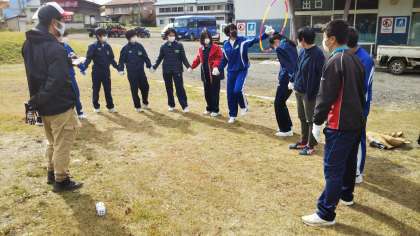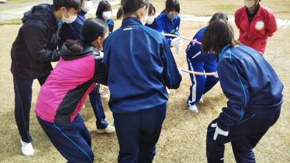 ジップラインが終わり、フラフープなどを使って、チームで課題を解決するゲームをしました。