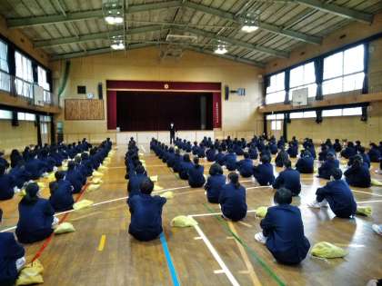 3学期の最初の学年集会では、転入生の紹介やチャレンジテストについての話を聞きました。そして、3学期に入っても時間をしっかりと守ること、
