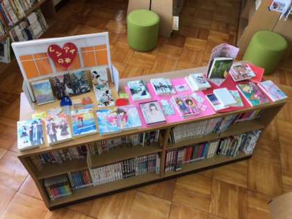 また、恋愛特集開催中です。図書館ボランティアの方が飾り付けてくれましたので、ご覧ください。