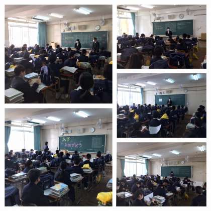 新入生は理科室で教科書を受け取り、教室に行きました。担任の先生から自己紹介や学校生活、授業などのさまざまな話がありました。新入生はこれから始まる中学校生活について、真剣な顔で聞いていました。