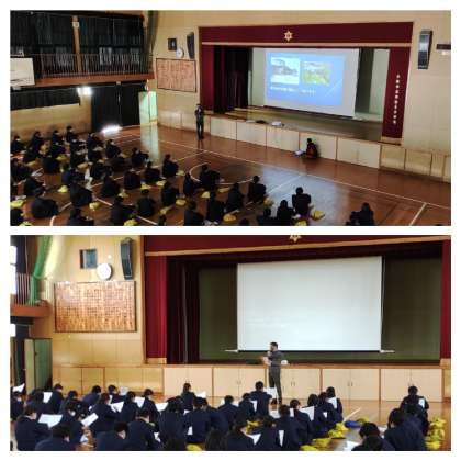 19日(月)の1限に、修学旅行に向けて集会を行いました。まず、パワーポイントを用いて、職員が下見のときに撮った画像を見せながら3日間の流れを説明しました。次にプリントを配って詳細を伝えました。