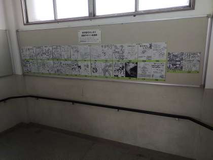 美術の課題になっていた「修学旅行のしおり」の表紙の候補が3年生の教室につながる階段に掲示されました。学年での総選挙によって、しおりの表紙が決まります。力作揃いで、どれに投票するか悩んでしまいますね。