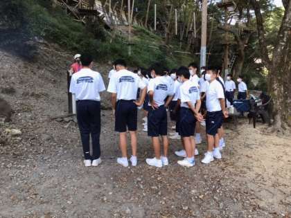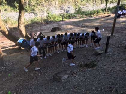 みんなで筒を使ってボールをゴールまで運ぶチームビルディングに挑戦中です。