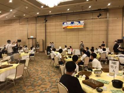 夕食会場で入館式を行いました。その後、食事係の「いただきます」のあいさつを受けて、夕食が始まりました。