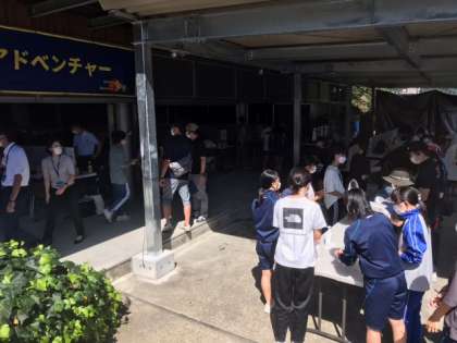 午前中の活動が終わり、昼食中です。昼食はカレーライスです。