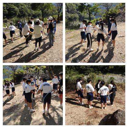 チームビルディングの様子です。円を作ってフラフープを通していきます。18秒で一周するグループもいます。