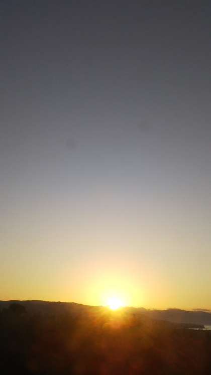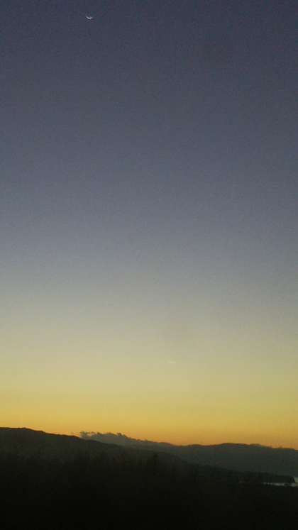 夜明け前、西の空に二十六夜の逆三日月が浮かんでいました。夜明けは6時1分。オレンジの太陽が昇ってきました。気温17℃、快晴です。