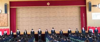 続いて、在校生より「歓迎の言葉」、新入生より「誓いの言葉」が読み上げられました。緊張した面持ちではありましたが、東住吉中学校への入学に向けて、新たなスタートを誓う言葉を堂々と述べてくれました。最後に、1年生の先生方の紹介がおこなわれます。この後は各教室に戻り、学級活動がおこなわれます。