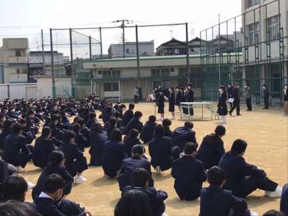 伝達の後、生徒会主導のもと、対面式を行いました。式では、在校生の代表から「東住吉中学校の生徒の一員として、共に協力し合い、悔いのない楽しい学校生活を送っていきましょう。」という歓迎の言葉があり、新入生の代表は「東住吉中学校の生徒として、ふさわしくなれるように、勉強や部活動に一生懸命に取り組みたいと思います。」と誓いの言葉を述べていました。