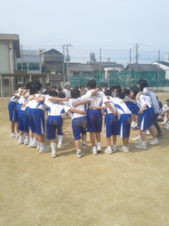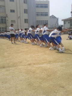 綱引き大会はトーナメント戦の1本勝負で行われ、3組と4組の決勝になりました。円陣を組んで、気合いを入れて、いざ勝負!引いて引かれての1分半近くの大接戦を制したのは……3組でした!