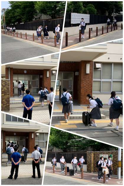 3年生は明日からの修学旅行に備えて、大きなカバンに荷物を入れての登校となっています。ボストンバッグを肩にかけたり、キャリーバッグを転がしたりの登校風景でした。