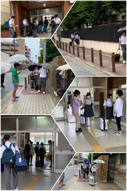 あいにくの雨模様ですが、続々と3年生が登校しています。校舎に入って検温をすませると体育館に集合です。