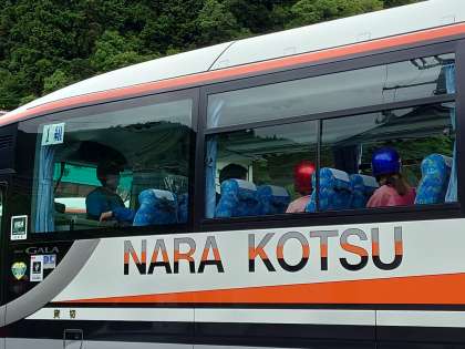 ウェットスーツに着替えて、バスに乗りのみ1組からラフティング体験に出発します!