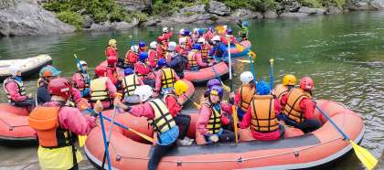 小雨ですが、川の水位がちょうど良い程度に高まり、絶好のラフティング機会とのことです。出発の様子です。