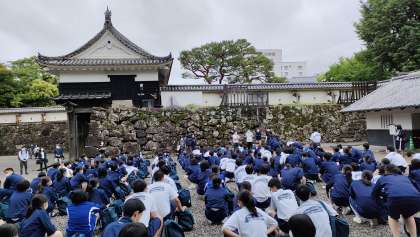 時間通り高知城に到着しました。これから学級写真を撮影し、高知市内フィールドワークに取り組んでいきます。