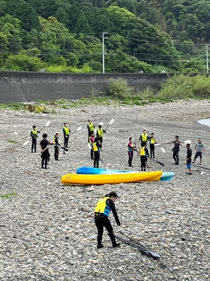 マリンアクティビティでは、ウェットスーツに着替えて、シーカヤックやシュノーケリングをおこないます。インストラクターさんから講習を受けている様子です。