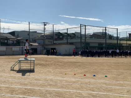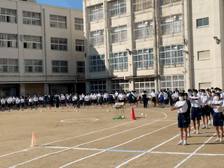 最初の競技、合同体操です。台上の模範演技に合わせて全員で準備運動を行います。