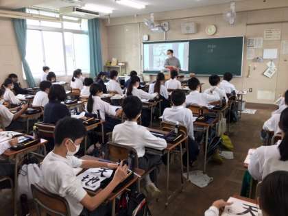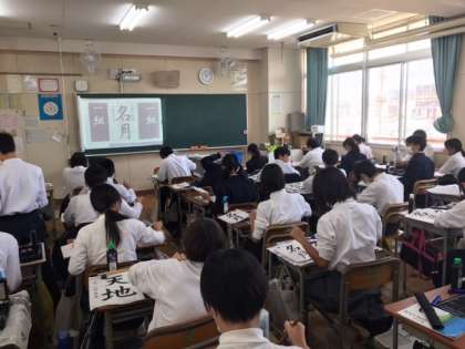 1年の国語科では、書道に取り組んでいます。楷書で「天地」や行書で「名月」に挑戦しました。文化の集いに展示しますので、ぜひご覧ください。