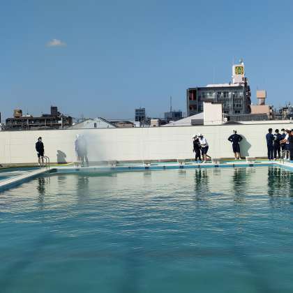 本日、東住吉消防署と東住吉区役所の方々に来ていただき防災学習に取り組んでいます。屋上プールでは、プールの水を利用し、可搬式ポンプの使い方を学んでいます。