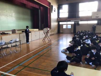 昼食後、すぐに国語係が準備してくれて、国語係の司会のもと、いよいよ百人一首大会が始まりました。読み人は1年生の先生たち。校長先生も来てくれました。太鼓の合図の後に繰り出されるバラエティに富んだ読み方にたくさんの生徒が翻弄されました。しかし、生徒の表情は真剣そのもの。1枚でも多くの札を取ろうと必死になっていました。