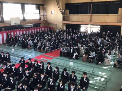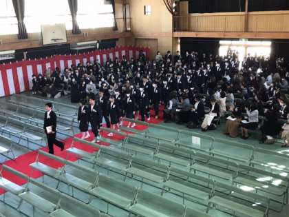 第74回卒業証書授与式が始まりました。盛大な拍手を受けながら、1組から順に入場しました。