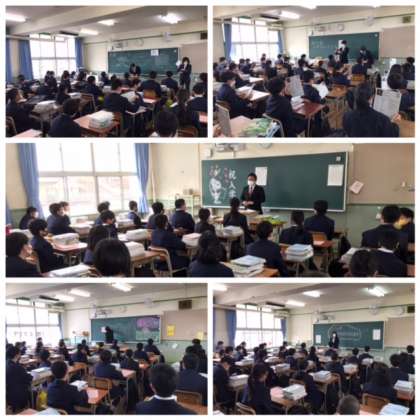 新入生は理科室で教科書を受け取り、教室に行きました。担任の先生から自己紹介や学校生活、授業などのさまざまな話がありました。新入生はこれから始まる中学校生活について、真剣な顔で聞いていました。