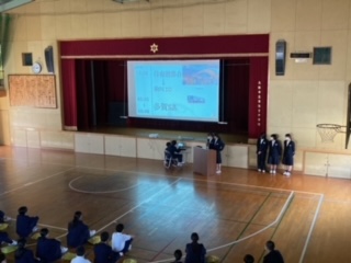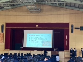 13日(木)6限に、修学旅行についての説明を行いました。代表の生徒たちが、修学旅行の行程についてと、行き先の一つである長野県についてそれぞれパワーポイントを作成し、発表をしてくれました。2年生のうちから放課後に残って一生懸命作ってくれたパワーポイントは、とてもわかりやすく、おもしろく、修学旅行がより楽しみになるものでした。係の皆さん、ありがとうございました。
